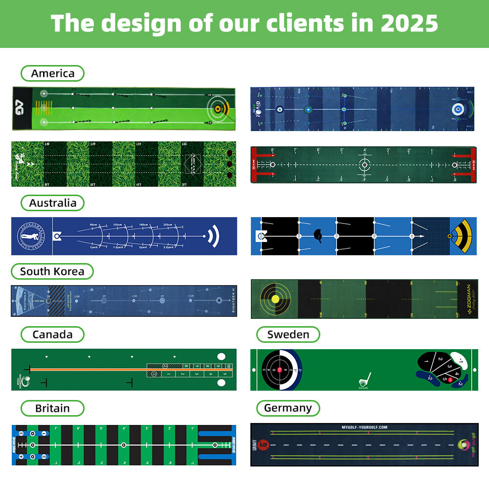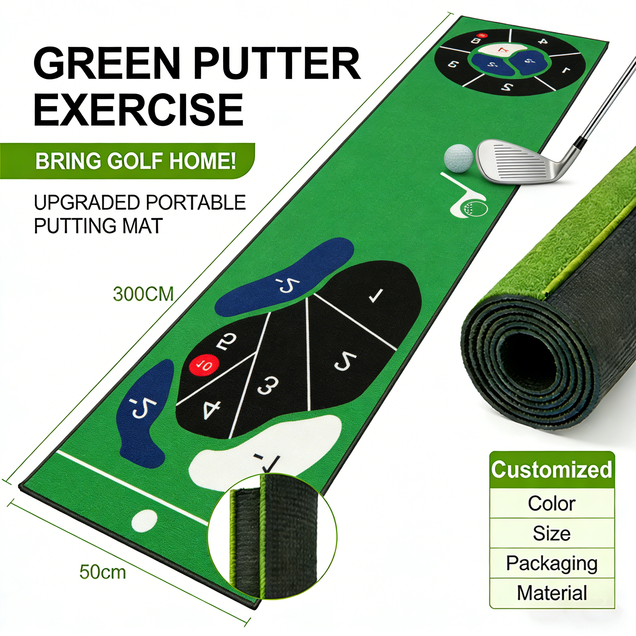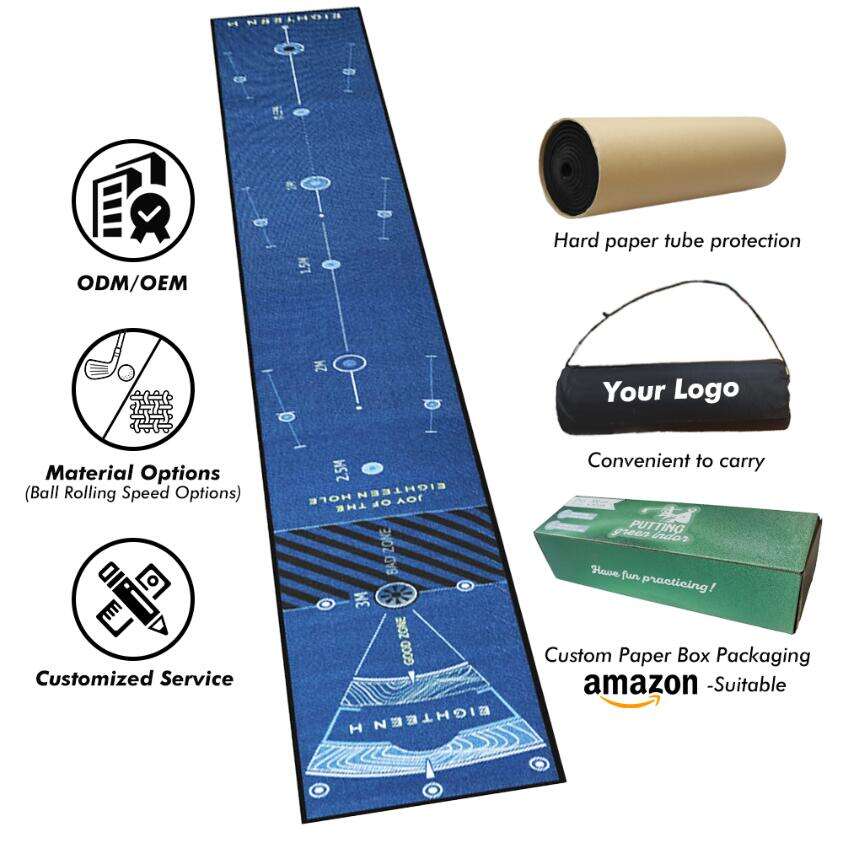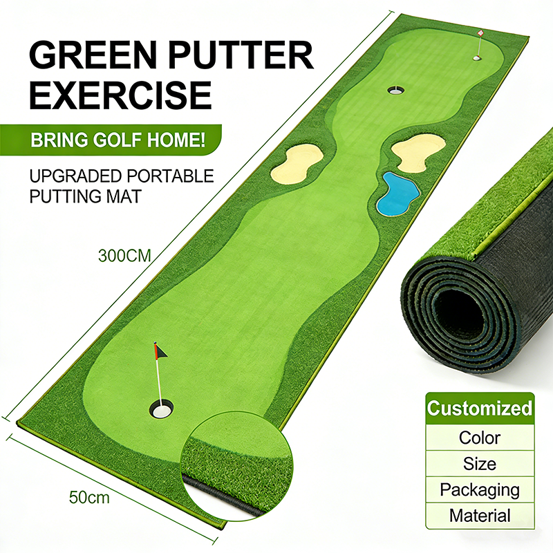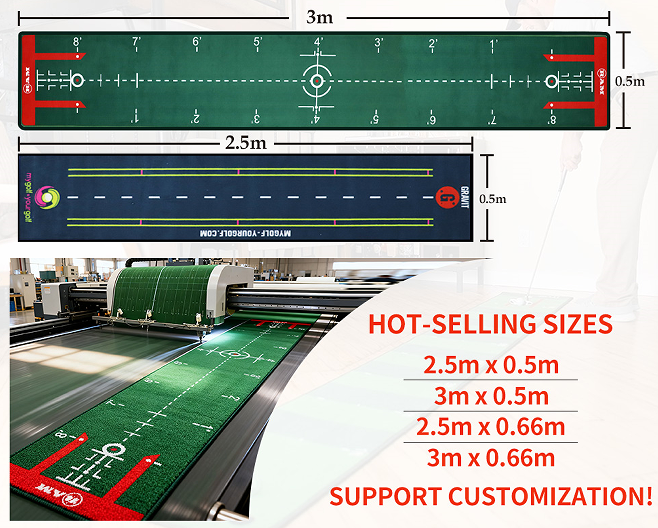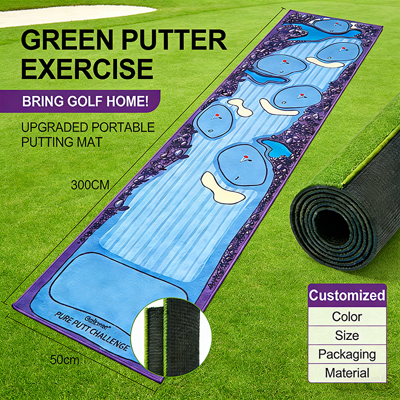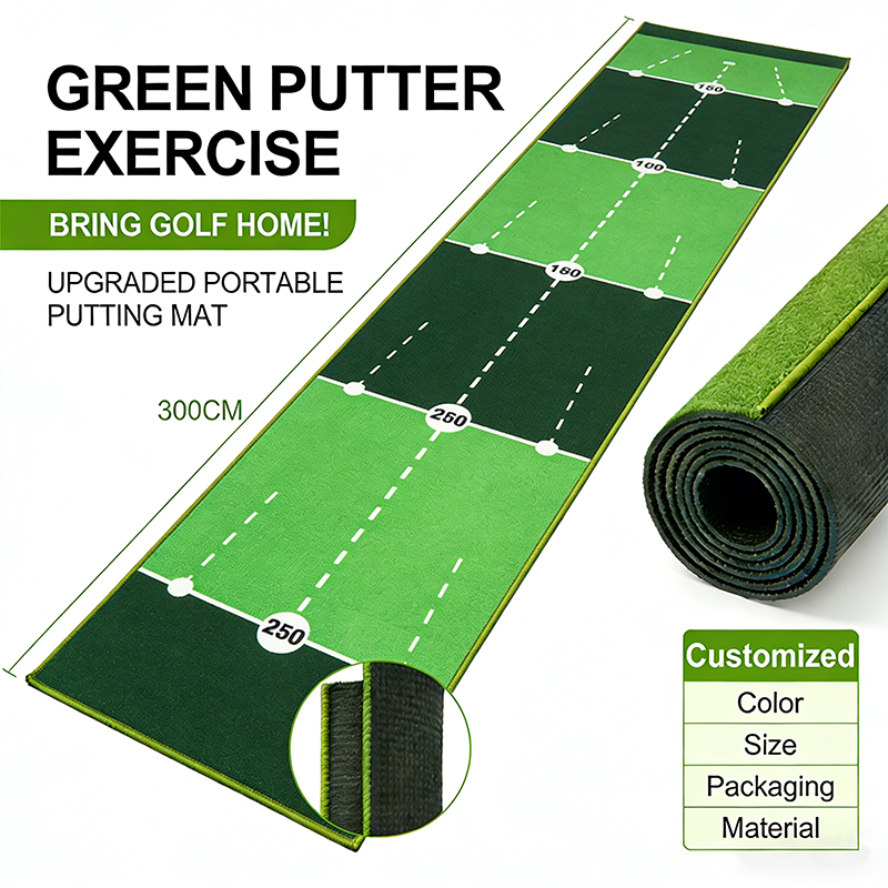 Available in fixed sizes (10ft×1.33ft, 7.87ft×1.64ft, etc.) and fully customizable for size, color, and pattern, it caters to diverse branding or personal preference needs—with multiple design styles to simulate different course conditions. Certified by Oeko-tex100, ISO9001 and other standards, it guarantees safety and reliability for widespread use.