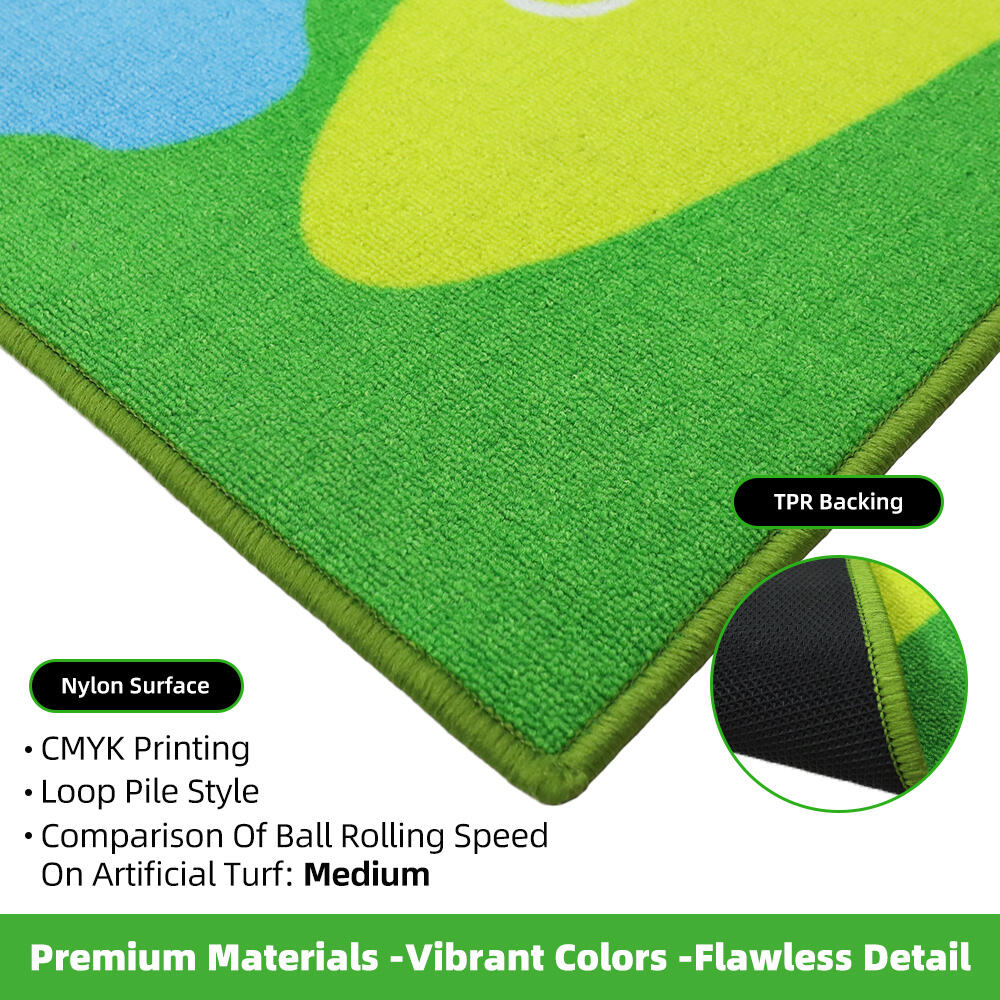 This golf putting practice mat is a practical tool for golfers to train at home. The surface is made of 100% nylon (or polyester fiber) material, with a 3mm cut velvet and a weight of 350g/m ²; The backing is made of anti slip black TPR material, weighing 900-1200g/m ², and is paired with high-quality locking technology to enhance durability. It offers fixed sizes such as 10ft x 1.33ft, 7.87ft x 1.64ft, and supports size and color customization. It has also passed multiple standard certifications such as Oeko-tex100 and ISO9001. This practice mat is portable and easy to store, suitable for indoor scenes such as offices and homes. It has multiple pattern styles and can simulate a sports field environment to help improve putting skills.