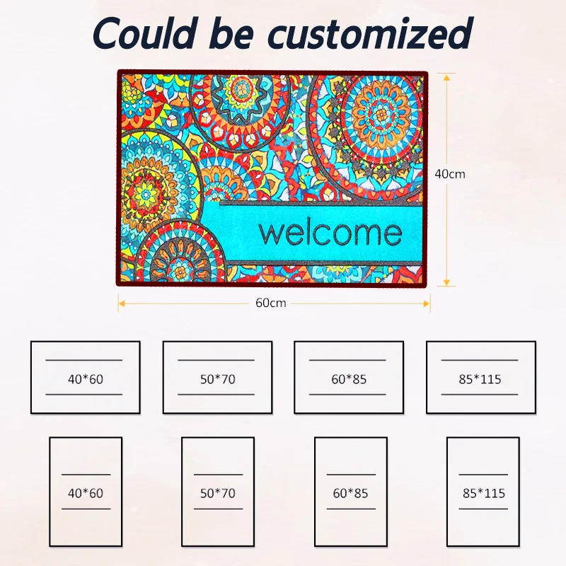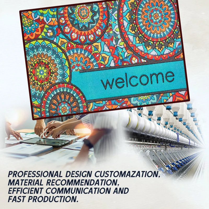 This household kitchen anti-slip floor mat is available in four models (DK-2450, DK-2000, DK-2200, DK-2300), with surface materials including 450gsm tufted nylon and 600/700/950gsm twisted nylon that correspond to surface thicknesses of 3mm to 6–7mm; all models are fitted with 2000gsm rubber backing for reliable slip resistance, leading to total thicknesses of 5mm to 8–9mm and price grades ranging from low to high. It adopts high-precision spot inkjet printing equipment imported from Austria, supports 12 color options selected from the Pantone solid coated system (including white and black) for personalized modern welcome designs, offers hot-selling sizes of 40×60cm, 60×90cm, 80×120cm and 90×150cm, and provides fully customizable designs and sizes with a maximum dimension of 200cm×1200cm to fit various kitchen layouts.