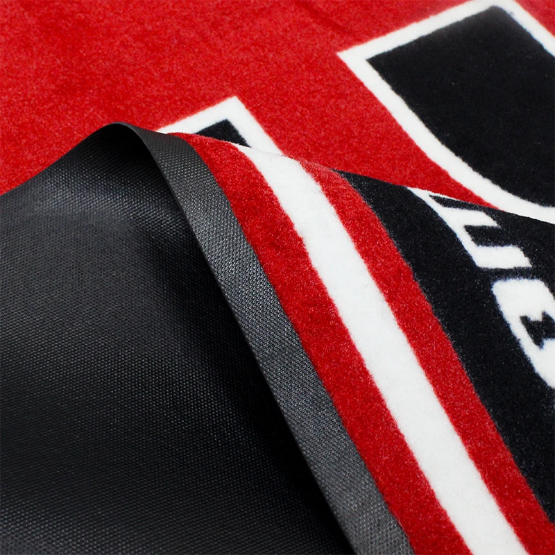 This custom logo floor mat comes in four models (DK-2450, DK-2000, DK-2200, DK-2300), featuring surface materials of 450gsm tufted nylon and 600/700/950gsm twisted nylon with corresponding surface thicknesses of 3–7mm; all models are fitted with 2000gsm rubber backing, resulting in total thicknesses of 5–9mm and price grades ranging from low to high. It adopts Austrian-imported spot inkjet printing technology, supports 12 color options selected from the Pantone solid coated system (including white and black), offers hot-selling sizes of 40×60cm, 60×90cm, 80×120cm and 90×150cm, and allows for fully customizable designs and sizes with a maximum dimension of 200cm×1200cm.