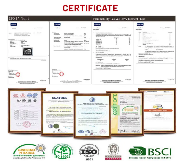 The production and quality assurance system is perfect, and the production process covers nine standardized links, namely tufting, gluing, printing, yarn printing, backing, cutting, edging, needle inspection, and packaging, to ensure the standardization of product production. The product has passed multiple authoritative certifications, including Intertek certification, OEKO Tex Standard 100 textile hazardous substance testing certification ISO 14001、ISO 9001、 Bureau Veritas certification and BSCI business social standard certification ensure comprehensive product safety and quality.